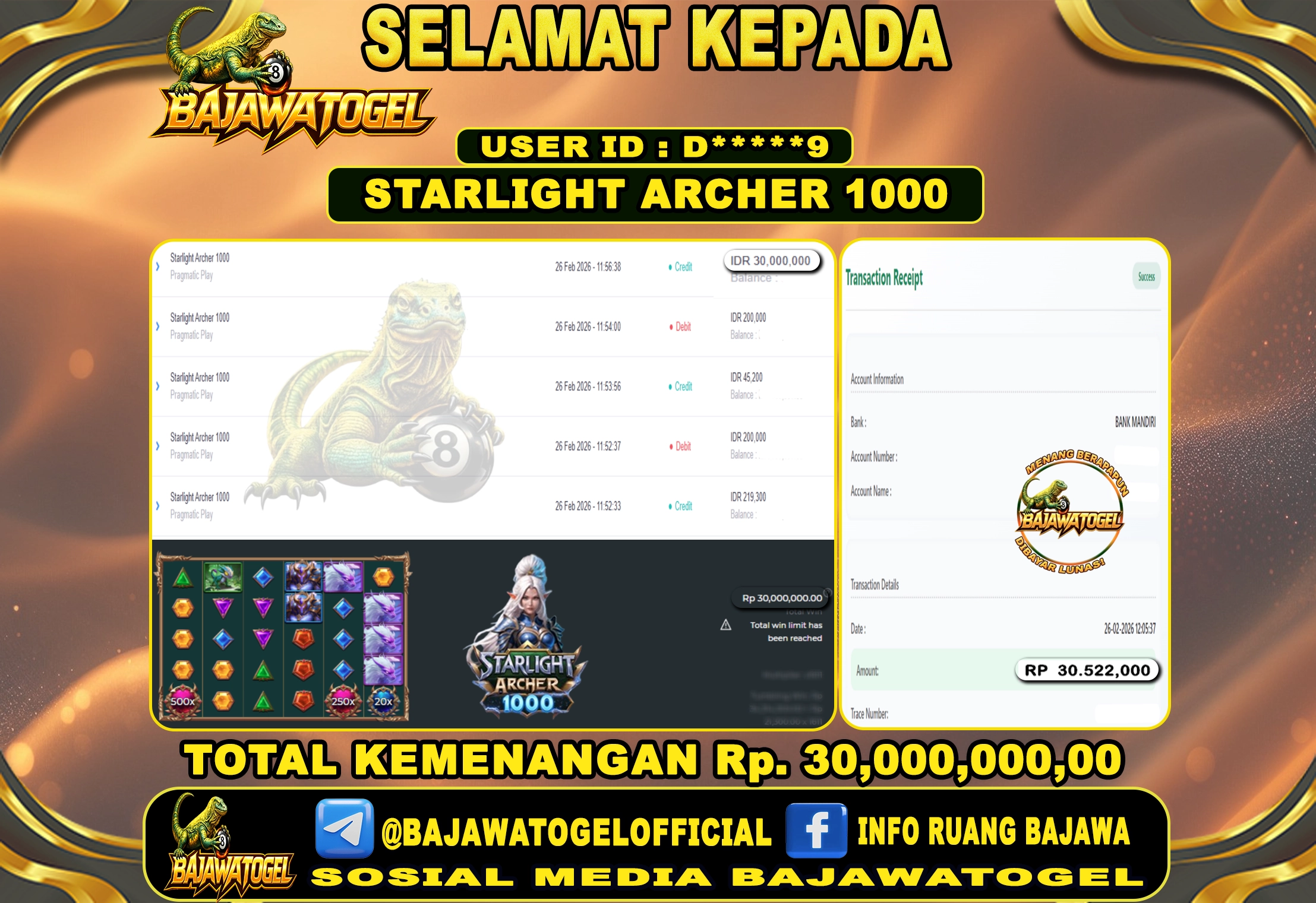 BUKTI JACKPOT SLOT STARLIGHT ARCHER 1000 JUMAT, 27 FEBUARY 2026 Rp.30.000.000 - LUNAS