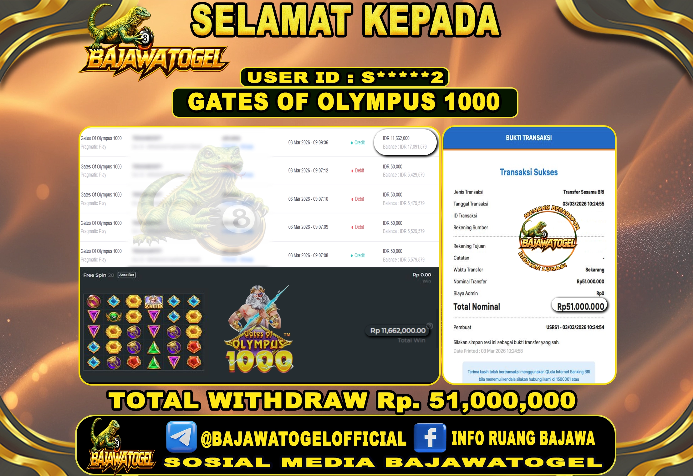 BUKTI JACKPOT SLOT GATES OF OLYMPUS 1000 SELASA, 03 MARET 2026 Rp.51.000.000 - LUNAS