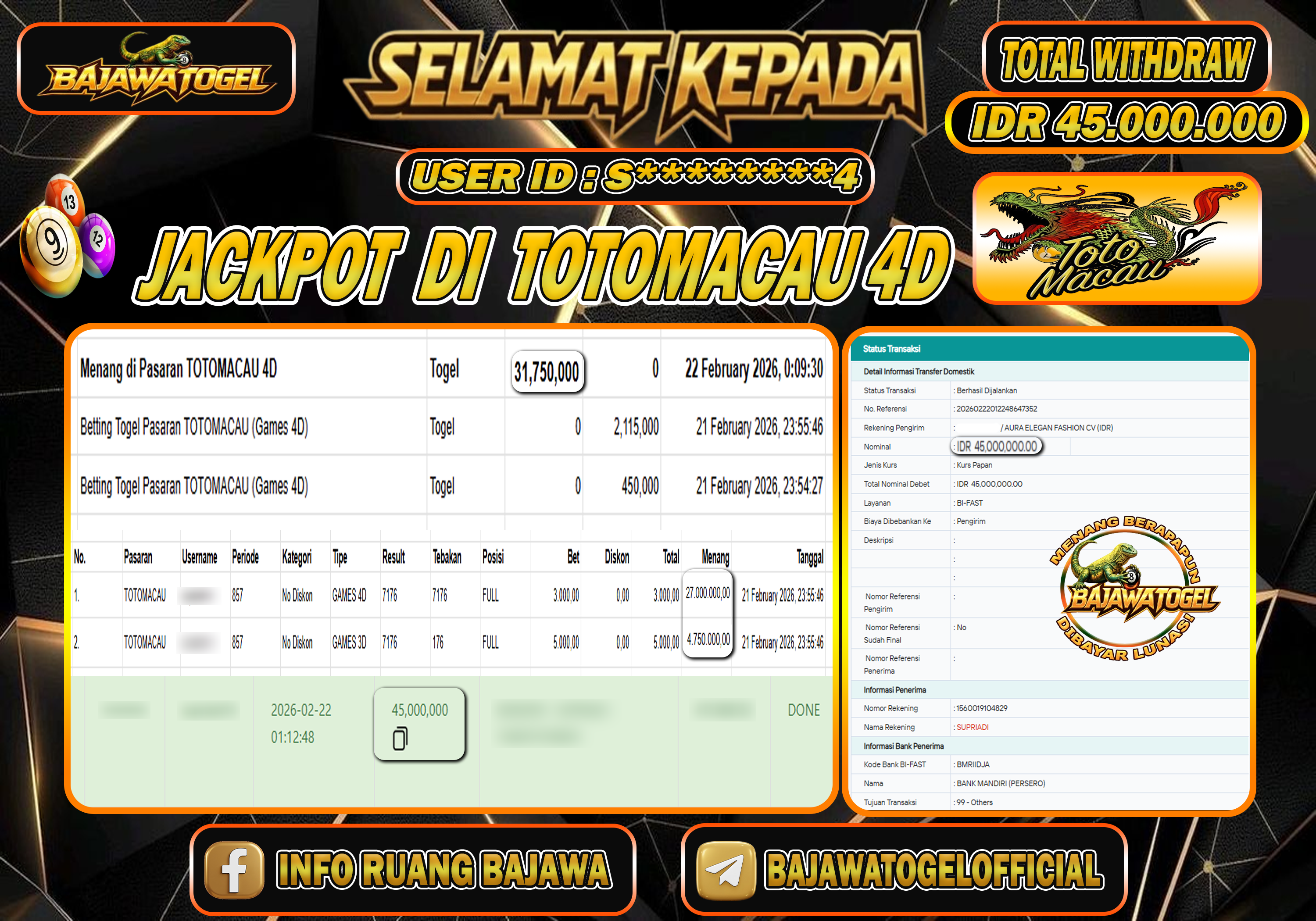 BUKTI JACKPOT TOGEL TOTO MACAU 4D MINGGU, 22 FEBUARY 2026 Rp.45.000.000 - LUNAS