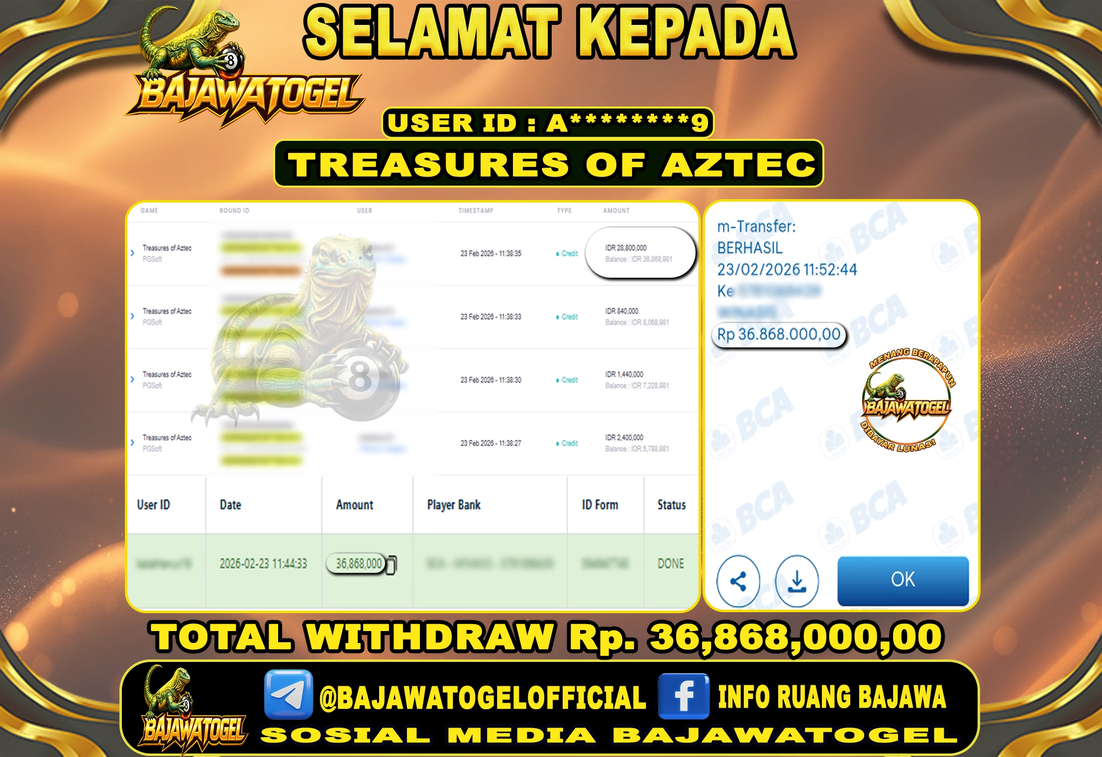 BUKTI JACKPOT SLOT TREASURES OF AZTEC RABU, 25 FEBUARY 2026 Rp.36.868.000 - LUNAS
