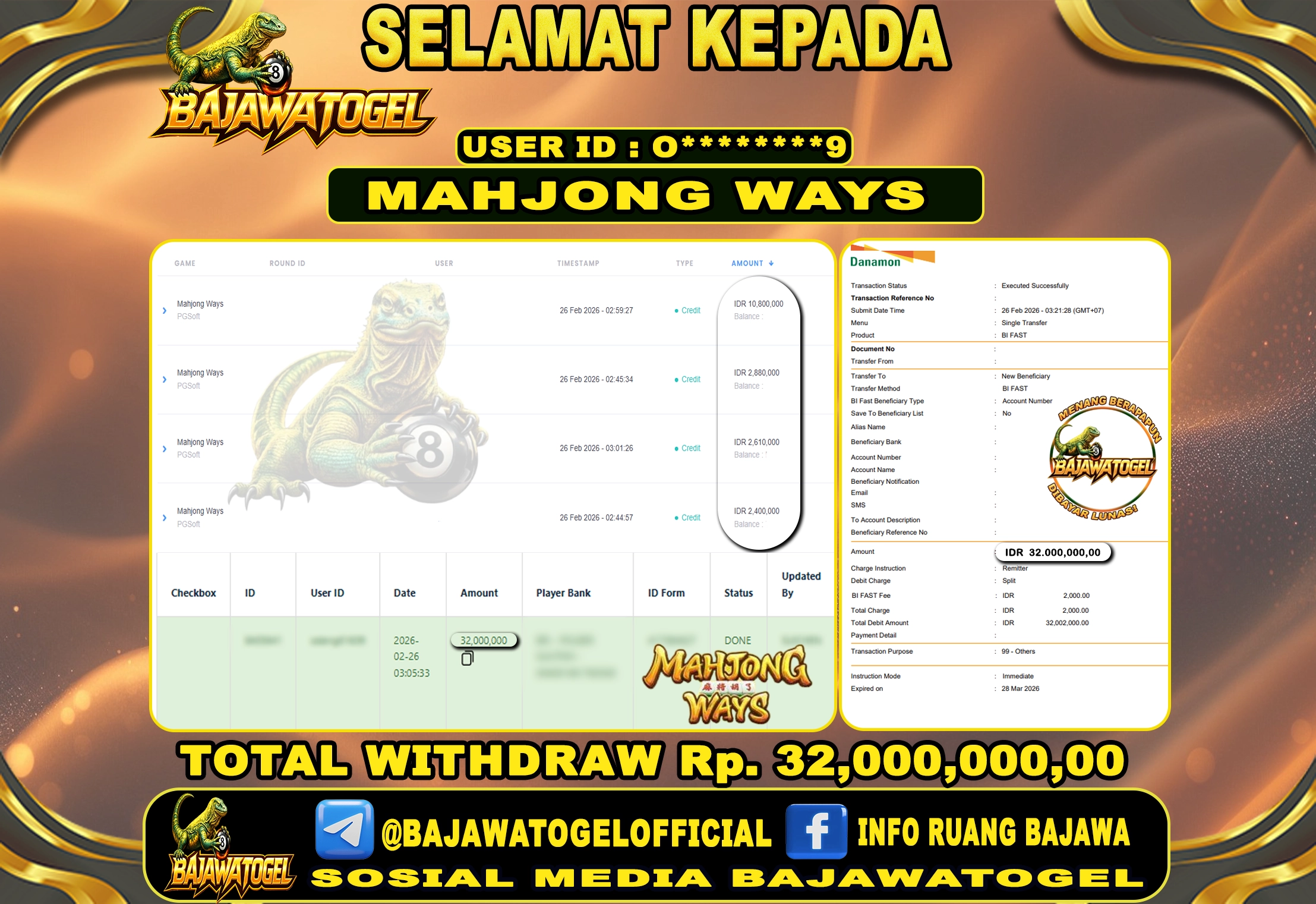 BUKTI JACKPOT SLOT MAHJONG WAYS KAMIS, 26 FEBUARY 2026 Rp.32.000.000 - LUNAS