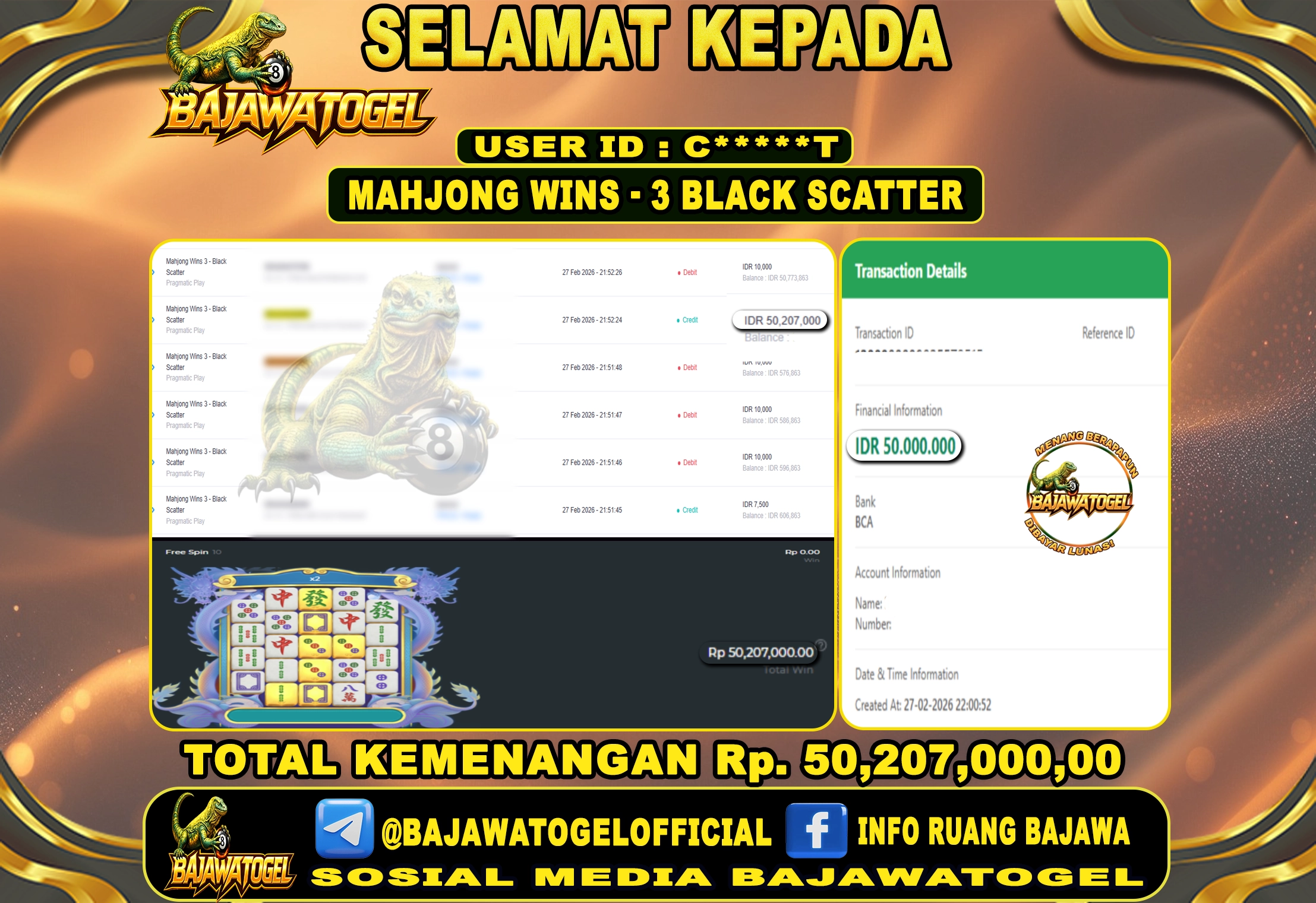 BUKTI JACKPOT SLOT MAHJONG WINS - 3 BLACK SCATTER SABTU, 28 FEBUARY 2026 Rp.50.000.000 - LUNAS