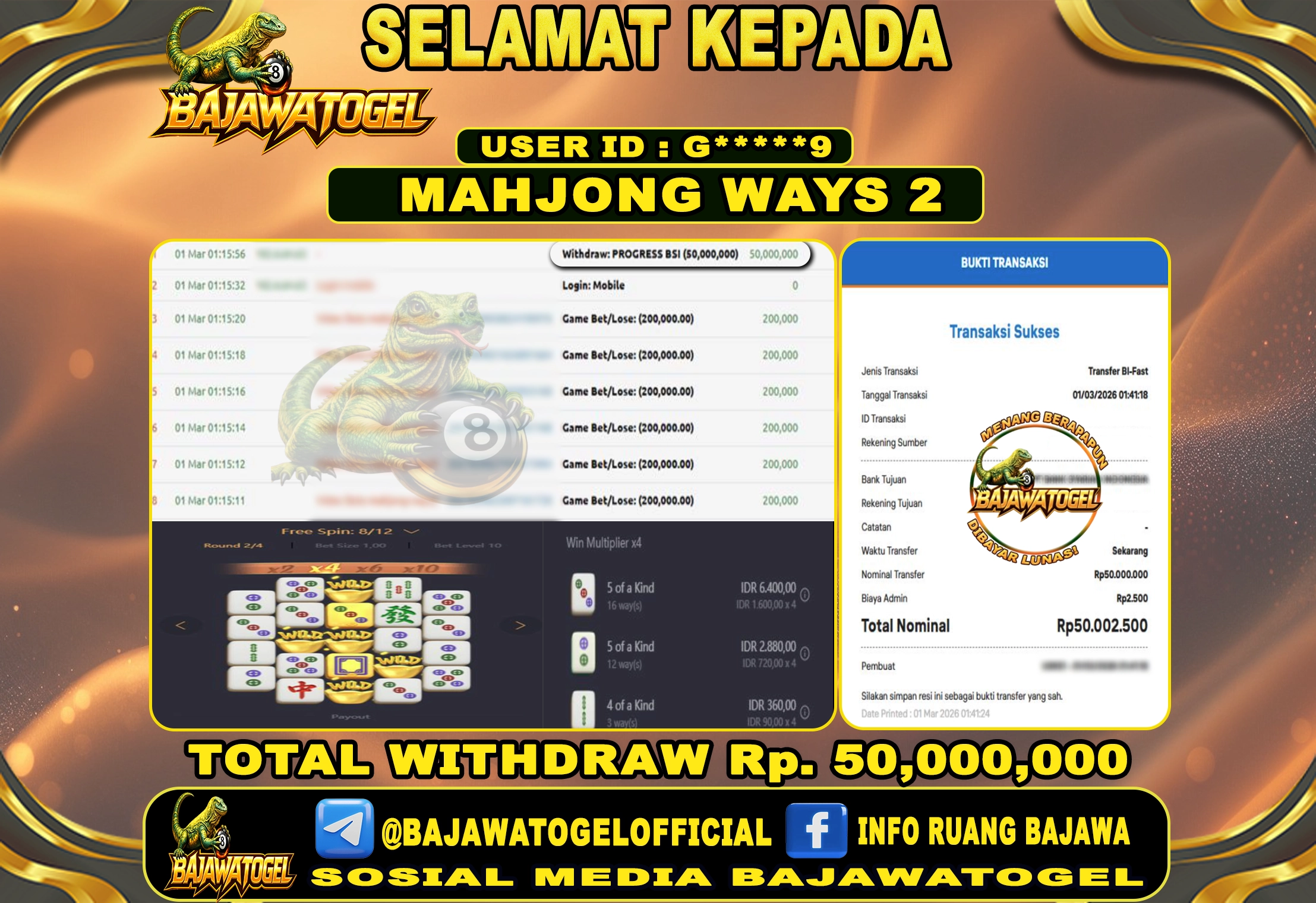 BUKTI JACKPOT SLOT MAHJONG WAYS 2 SENIN, 02 MARET 2026 Rp.50.000.000 - LUNAS