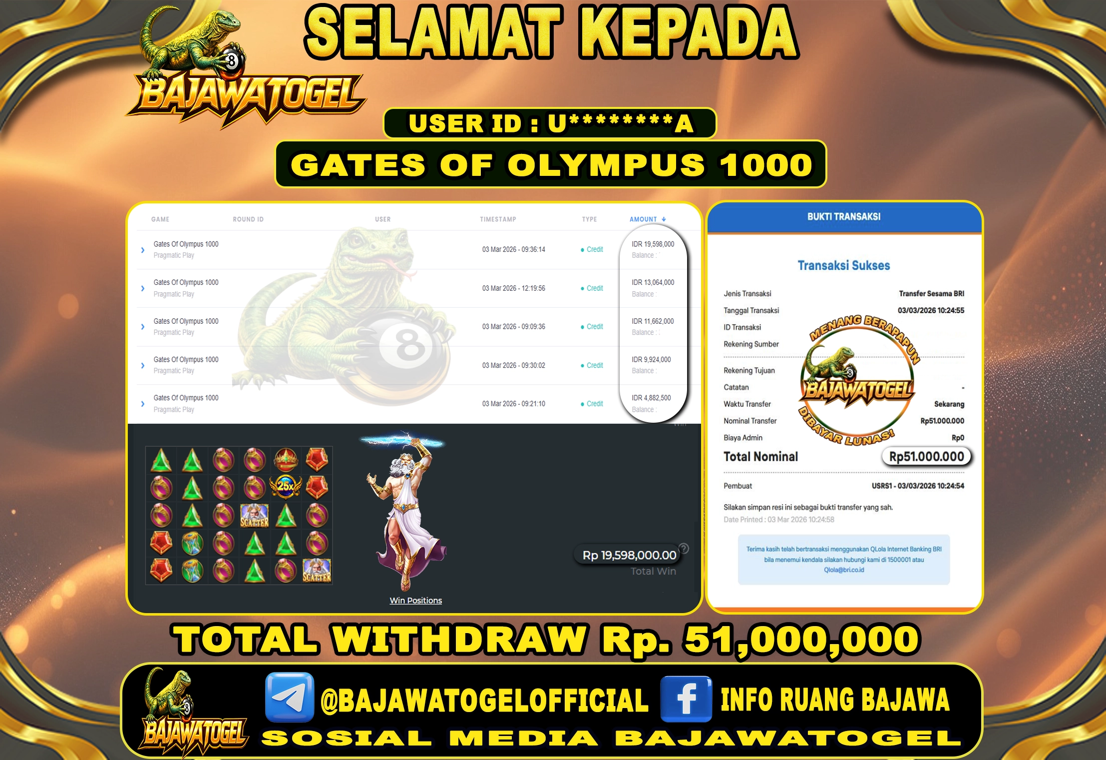 BUKTI JACKPOT SLOT GATES OF OLYMPUS 1000 SELASA, 03 MARET 2026 Rp.51.000.000 - LUNAS