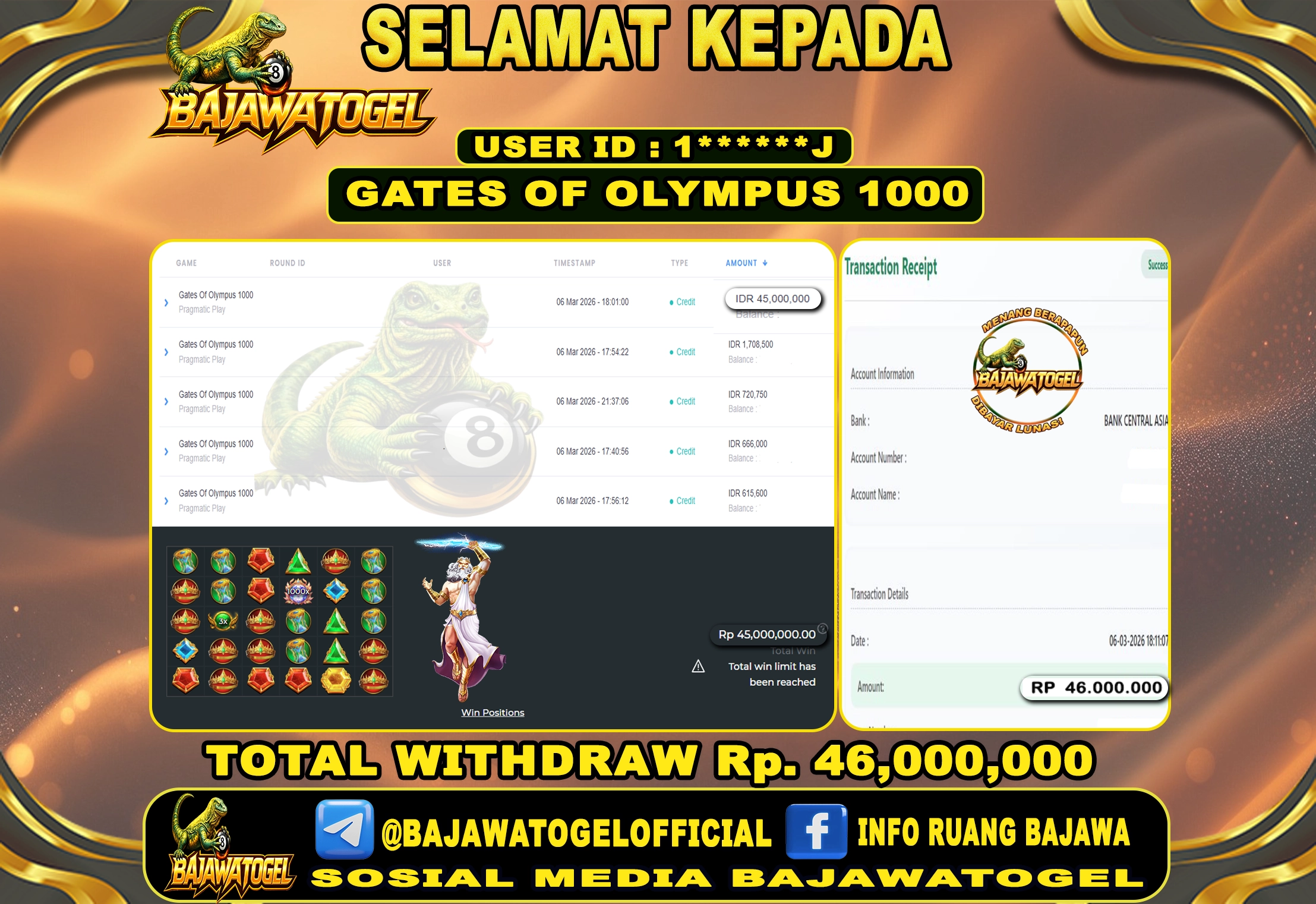 BUKTI JACKPOT SLOT GATES OF OLYMPUS 1000 SABTU, 07 MARET 2026 Rp.46.000.000 - LUNAS