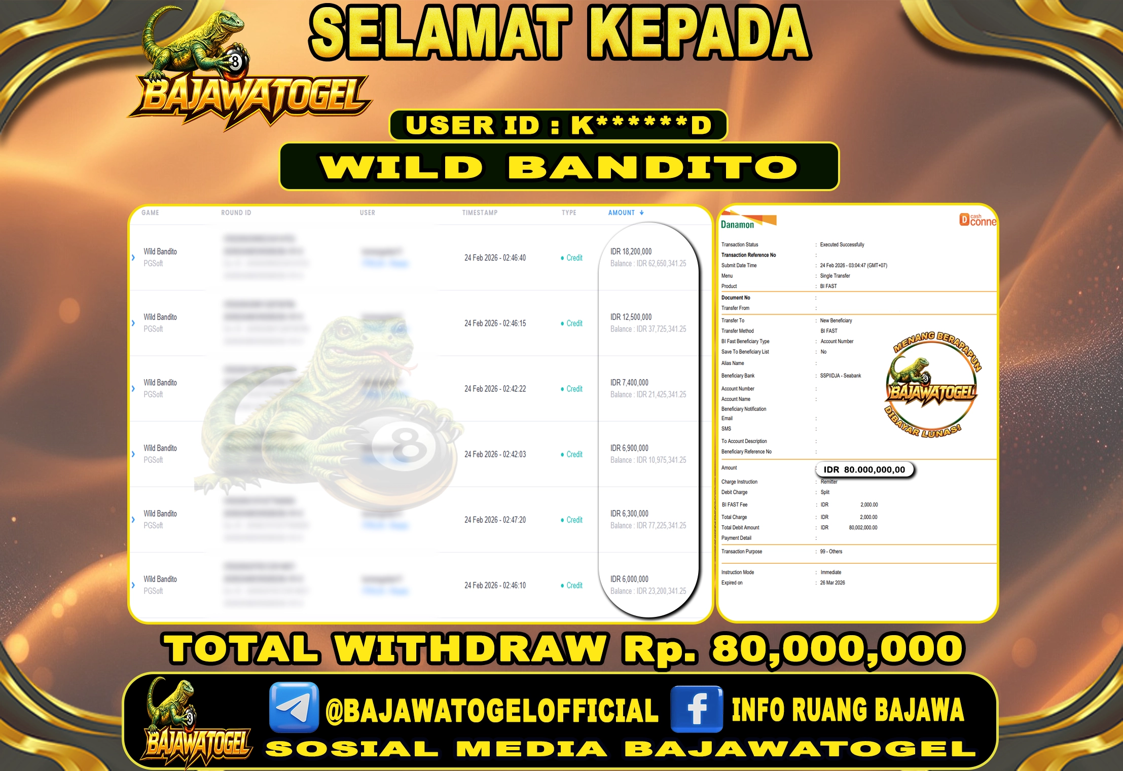 BUKTI JACKPOT SLOT WILD BANDITO SELASA, 24 FEBUARY 2026 Rp.80.000.000 - LUNAS