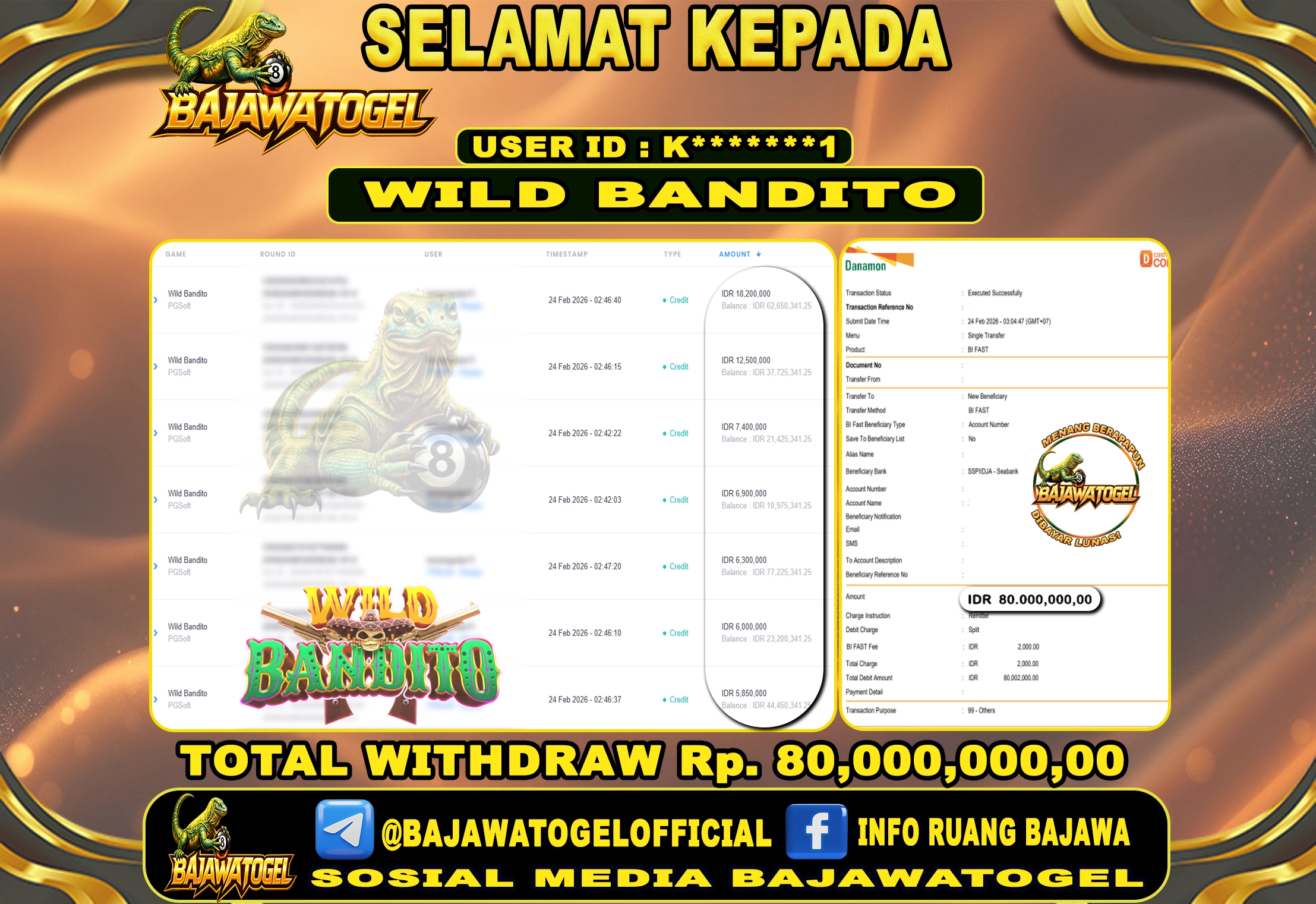 BUKTI JACKPOT SLOT WILD BANDITO RABU, 25 FEBUARY 2026 Rp.80.000.000 - LUNAS