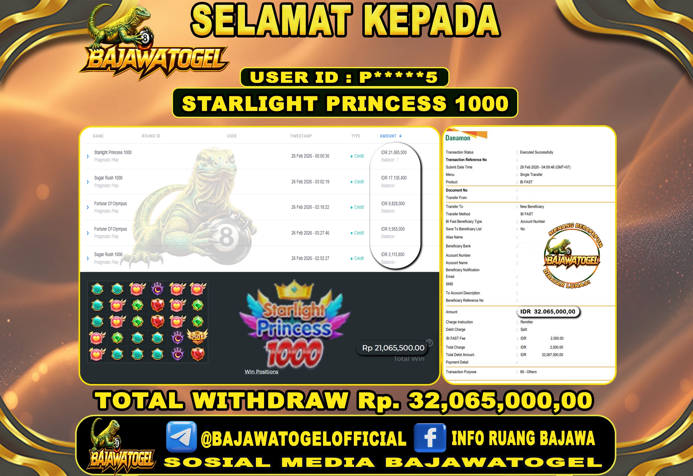 BUKTI JACKPOT SLOT STARLIGHT PRINCESS 1000 KAMIS, 26 FEBUARY 2026 Rp.32.065.000 - LUNAS